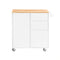 [PRODUKTINFORMATION]: Vikt: ca 17 kg; bärkapacitet upp till 30 kg. Material: MDF (E1), arbetsyta i massiv heveaträ. Mått: ca 67x86x38 cm. Perfekt som kompakt köksmöbel eller multifunktionell serveringsvagn i små utrymmen.