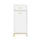 Det unika linjemönstret, det blanka vita skåpkroppen och de gyllene metallbenen presenterar ett enkelt, elegant skåp som ger badrummet en modern touch
